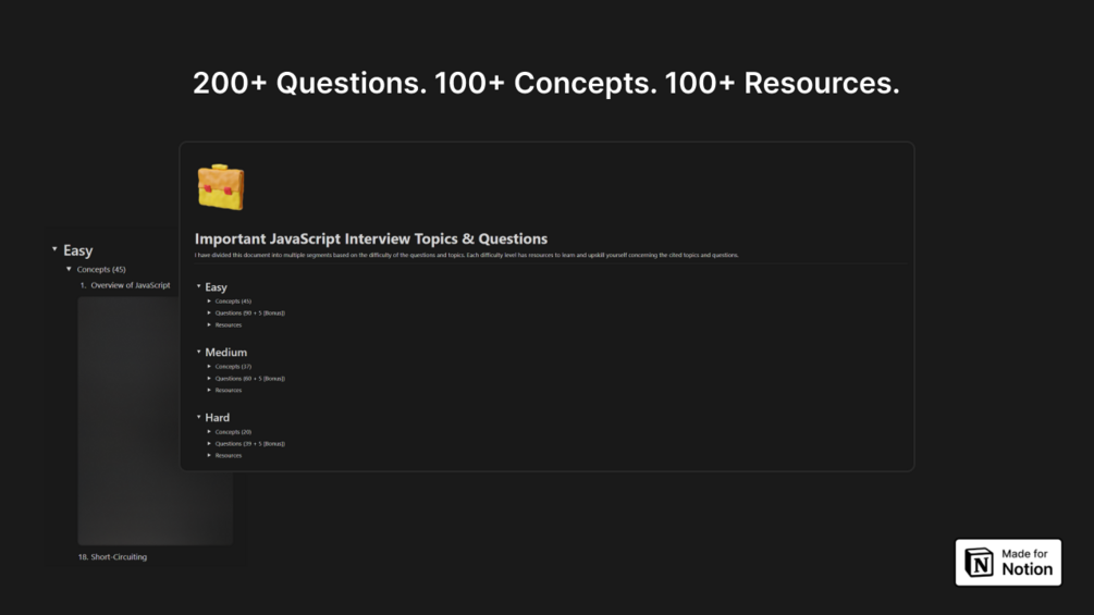 You'll get 207 JavaScript Interview Questions, 102 Unique Key JavaScript Concepts, and 102 resources to learn them.